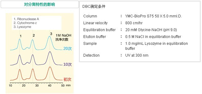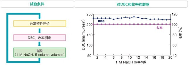 對于蛋白質(zhì)純化用色譜柱的清洗/殺菌常采用堿性溶液進(jìn)行定位清洗的方法(CIP:cleaning in place)。YMC-BioProl離子交換填料因為具有卓越的耐堿性,所以即使使用1M NaOH實(shí)施20次的CIP也能維持高DBC和收率,而不會(huì )發(fā)生分離特性的改變。