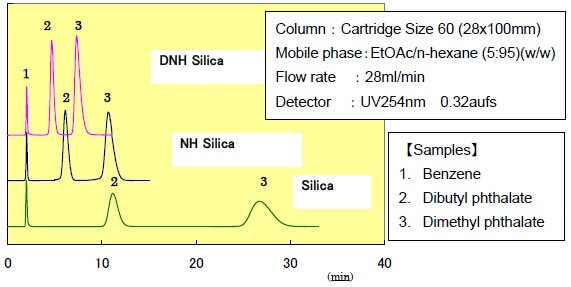 圖1 裸硅膠、NH、DNH硅膠對中性樣品的分離對比
