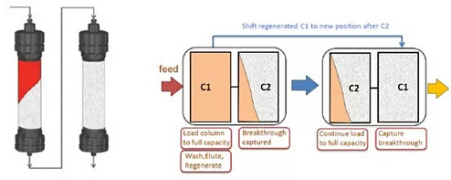 ? ? ? ?Capture SMB是將第一根層析柱的上樣流穿繼續上樣至第二根層析柱,待第一根層析柱完全滿(mǎn)載后,方結束其上樣,進(jìn)行淋洗、洗脫等操作,而此時(shí)第二根層析柱仍在繼續上樣。通過(guò)切換柱位操作,保證2根層析柱的洗脫、再生、上樣等操作交替銜接進(jìn)行,保證連續上樣,從而實(shí)現工藝與系統硬件設計的高度契合,使填料利用率最大化,用量大為縮減。