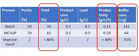 ? ? 有案例證明,MCSGP可將產(chǎn)品純度從傳統工藝的59%提升至70%,將收率從傳統工藝的34%提升至61%,從而使產(chǎn)量(g /L /h)整體提升80%,并同時(shí)使Buffer的消耗量降低55%。MCSGP工藝,無(wú)疑可顯著(zhù)地節約成本投入,并可產(chǎn)生更多的生產(chǎn)效益。