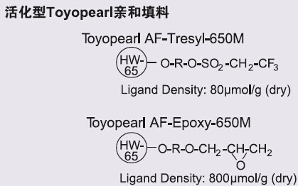 ?????? Toyopearl AF-Epoxy-650M活化型填料,也是干燥包裝,具有高密度的環(huán)氧基團(ca. 800μmol/ml)。在適當的反應條件下,可用于固定蛋白質(zhì)或低分子配體。當結合高密度低分子配體時(shí)特別有效。例如,谷胱甘肽和甘氨酸的耦合密度可達到大于100μmol/ml濕狀填料。Toyopearl AF-Epoxy-650M是一種多功能的原材料,可連接其他特殊應用所需的化學(xué)活性基團。這種填料可輕松被激活為含有酰肼的物質(zhì)。這對固定碳水化合物或糖蛋白特別有用。