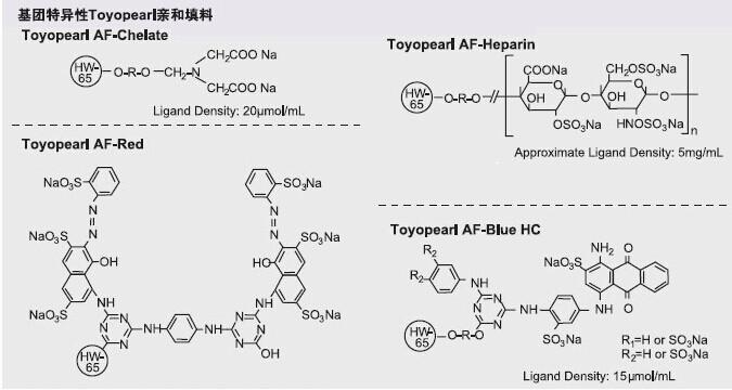 Toyopearl AF-Chelate-650M填料結合了亞氨基二乙酸(IDA),其濃度約20μmol/ml。通常與填料穩定螯合的金屬離子有Cu2+,Ni2+,Zn2+和Co2+等。金屬螯合后的填料可結合氨基酸序列中含組氨酸和自由半胱氨酸的多肽或蛋白質(zhì)。IMAC親和層析可用于純化重組人生長(cháng)因子,組織型纖溶酶原激活劑,血型糖蛋白以及整個(gè)細胞。