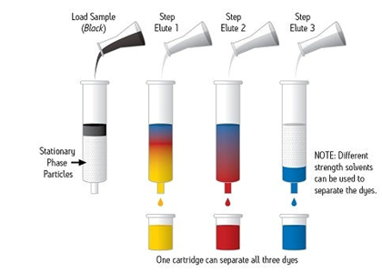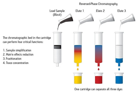 SPE通常是一種使用裝在柱芯型裝置內的固體顆粒和色譜填充材料對樣品中的不同組分進(jìn)行化學(xué)分離的樣品制備技術(shù)。樣品幾乎始終呈液態(tài),但特殊應用項目可能使用氣相中的某些樣品進(jìn)行。圖1顯示出一份樣品(圖示為黑色)正在使用SPE裝置進(jìn)行處理,以使組成該樣品的每種染色組分通過(guò)色譜分析實(shí)現分離。