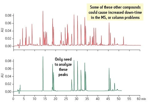 另一種考慮是存在于樣品基質(zhì)中的各種干擾物在每次進(jìn)樣時(shí)可能會(huì )蓄積導致儀器停機。如果這些干擾物能在樣品制備期間被除去,那么目標化合物就能使用一種更簡(jiǎn)單、更穩定的方法進(jìn)行分析(圖3)。此圖將位于靠上位置的原始樣品與位于靠下位置的經(jīng)SPE制備后的新樣品進(jìn)行了比較。