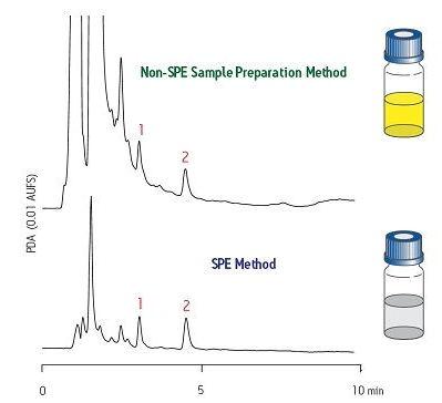 圖5給出了另一個(gè)示例??可系淖V圖表明化合物#1和#2均受到樣品基質(zhì)引起的明顯干擾??肯碌淖V圖表明使用SPE進(jìn)行適當樣品制備后可顯著(zhù)提高結果質(zhì)量(基線(xiàn)干凈)。請注意,一條明顯更干凈的基線(xiàn)可提高分析結果的準確度。如果該樣品需要對化合物進(jìn)行分離和純化,那么也可以獲得一種純度明顯更高的萃取物。