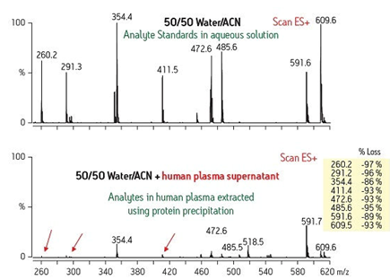 我們可以在圖6中看到這種效應??可系馁|(zhì)譜圖代表了目標化合物以生理鹽水作為溶劑進(jìn)樣時(shí)所獲得的信號??肯碌膱D譜表明當相同的化合物在人血漿中進(jìn)行分析時(shí)引起信號響應顯著(zhù)降低(抑制比例>90%)。在靠下的圖譜中,只進(jìn)行了一個(gè)常見(jiàn)的蛋白沉淀步驟。這種技術(shù)不能清除可引起離子抑制的基質(zhì)干擾物,從而導致信號響應差。