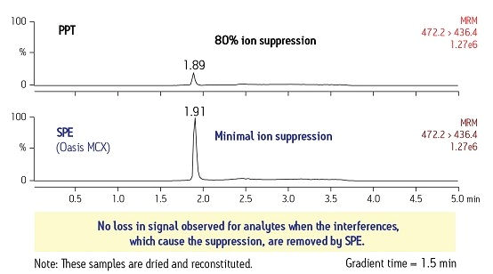 在有些情況下,源自樣品基質(zhì)的干擾物可能會(huì )增加某種化合物的信號,這叫做離子增強,可導致響應值偏高。適當的SPE方法可通過(guò)將干擾物與該化合物分離開(kāi)來(lái)而最大限度減弱這種效應,從而使響應值更準確。