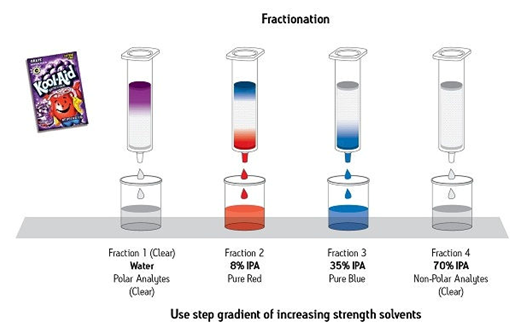 圖8給出了關(guān)于SPE分餾效力的一個(gè)示例。在這里,一種復雜的干粉樣品(紫葡萄混合飲品)被輕易分離成4種餾分:1種完全由極性化合物組成的餾分、1種純化型紅色化合物、1種純化型藍色化合物和1種包含所有其余非極性化合物的餾分。