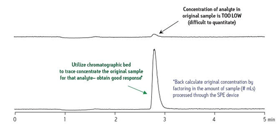 分析環(huán)境樣品中的痕量污染物或者代謝物在生物液體內隨時(shí)間的變化情況就是一個(gè)可以說(shuō)明這一點(diǎn)的較好例子。圖9中靠上的圖譜表明使用原始純樣品進(jìn)行分析時(shí),目標化合物的信號響應差。通過(guò)以SPE作為痕量濃縮策略制備樣品后再使用相同的分析條件進(jìn)行分析后所獲得的靠下的圖譜表明這種化合物的信號強度顯著(zhù)提高。根據這一結果,我們可以準確計算出純樣品中的原始化合物濃度。