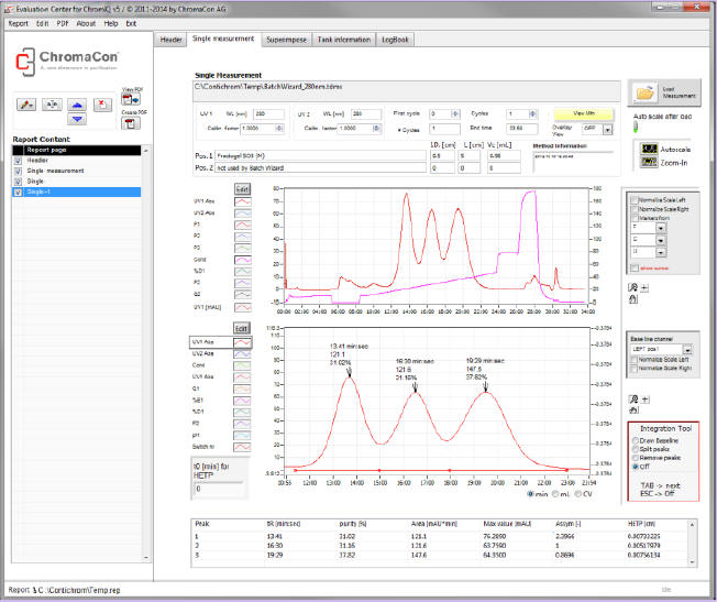 所有的Contichrom系統均具有完整的層析工藝運行能力,支持多種洗脫模式,ChromIQ軟件可以提供純化向導功能,以支持批生產(chǎn)工藝的設計和執行。