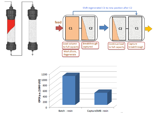 傳統層析工藝,由于流穿效應,有30-50%的填料是無(wú)法被完全利用的,從而使得載量和處理量大為受限。Capture SMB用于優(yōu)化捕獲環(huán)節,作為最簡(jiǎn)單和最強大的2柱位設計,可使純化效率顯著(zhù)提高,并且使填料用量大為縮減。
