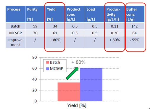有案例證明,MCSGP可將產(chǎn)品純度從傳統工藝的59%提升至70%,將收率從傳統工藝的34%提升至61%,從而使產(chǎn)量(g /L /h)整體提升80%,并同時(shí)使Buffer的消耗量降低55%。MCSGP工藝,無(wú)疑可顯著(zhù)地節約成本投入,并可產(chǎn)生更多的生產(chǎn)效益。