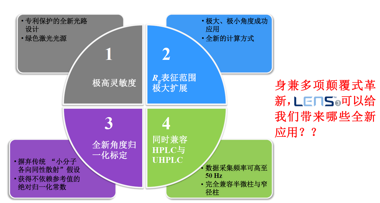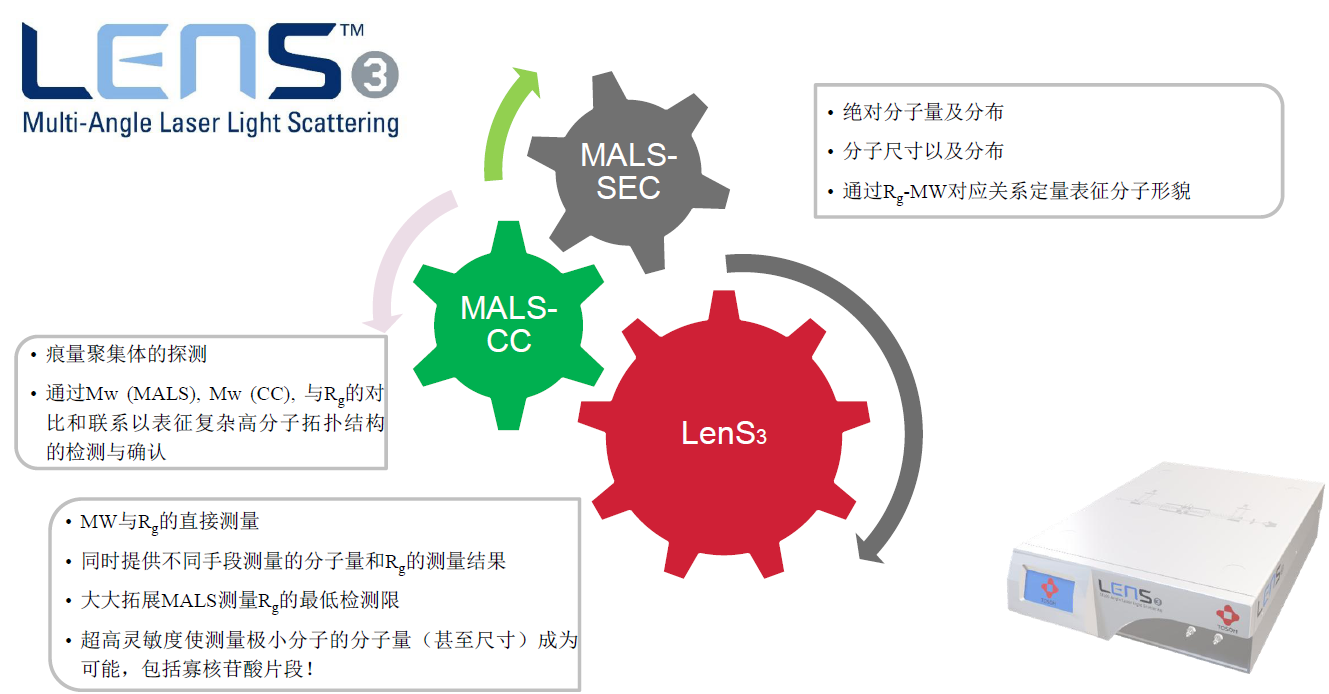 相較于自上世紀80年固有的光散射技術(shù),東曹推出的LenS3光散射采用全新設計概念,完美集成的一個(gè)極小角度(10°的LALS),一個(gè)極大角度(170° High Angle Light Scattering, HALS),和一個(gè)直角度(90°的RALS),從而達到: