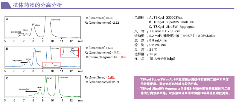 1. 使用粒徑3 μm的硅膠基質(zhì)為填充材料,比G3000SWXL等色譜柱具有更高的分子量排阻限,非常適用于分析抗體藥物中三聚體以上的多聚體等分子量較大的蛋白質(zhì)。