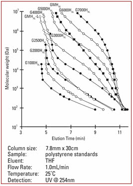4. Hxl型柱屬于常規GPC色譜柱,尺寸為7.8mm ID ×30cm。大多數HPLC系統無(wú)需進(jìn)行特殊的優(yōu)化(針對柱外峰展效應),即可使用常規的GPC色譜柱。