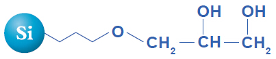二元醇基鍵合色譜柱在正相條件下,較硅膠色譜柱,能夠更好地識別化合物的親水性差異。利用這個(gè)特性的效應,實(shí)現了親水性差異較小的化合物的相互分離。并且,通過(guò)均一的二元醇基處理,防止了硅烷醇基的影響所造成的水的非特異性吸附,因此,可使用水100 %洗脫液進(jìn)行清洗??奢p松地清洗吸附在填料上的高極性化合物,長(cháng)期使用色譜柱。并且,較硅膠色譜柱,樣品負荷量大,最適于制備HPLC。