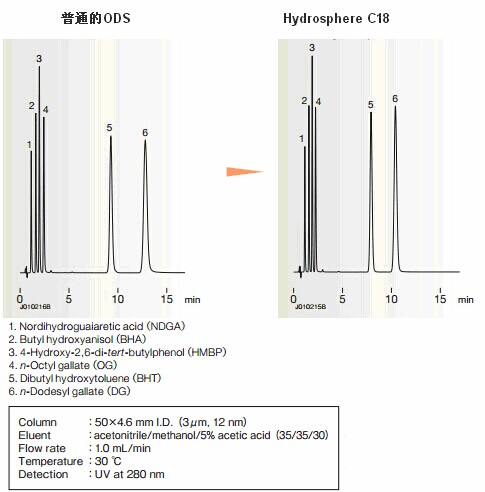 Hydrosphere C18色譜柱與普通的ODS色譜柱相比,通??煽s短20%左右的分析時(shí)間。