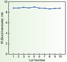 ??? 上圖顯示了疏水性作用的10批生產(chǎn)的批間再現性,這是色譜柱的基本參數,通過(guò)對生產(chǎn)過(guò)程的嚴格控制,獲得極穩定的批間再現性。其顯示了非常高的批次間重復性,在分析丁苯時(shí)候,以10批柱子的數據為例,保留時(shí)間的標準偏差小于1.5%,這數據大大低于普通的C18色譜柱。分析標準物質(zhì)時(shí),每根色譜柱的理論塔板數可達18600,壓力為2600psi。