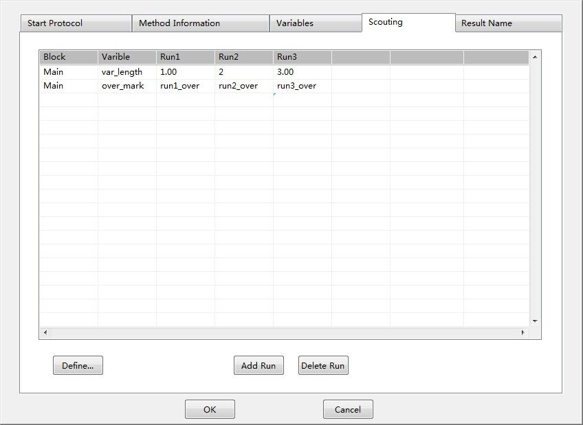 Scouting,即探索功能,通過(guò)將方法中的某些參數編輯成變量,然后通過(guò)Scouting設置,將同樣的方法運行多次,每次僅僅是自動(dòng)修改方法中的某個(gè)或某些參數,從而實(shí)現參數的自動(dòng)尋優(yōu),譬如尋找最適合的流速、尋找最適合的裝柱高度等。
