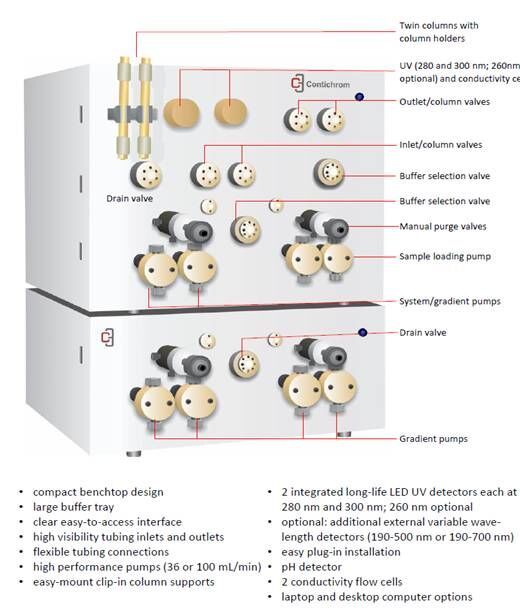 ChromaCon公司位于瑞士蘇黎世,是一家致力于層析設備及層析技術(shù)開(kāi)發(fā)的企業(yè),其自主研發(fā)的Contichrom系列層析系統,為一系列可用于連續純化的全自動(dòng)層析系統。