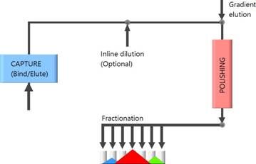 所有的Contichrom系統可以將兩個(gè)層析步驟(例如捕獲和精純)整合為一個(gè)單一的過(guò)程,第一步層析洗脫的產(chǎn)物可以直接被稀釋?zhuān)瑥亩苯舆M(jìn)行第二步層析,因此省略了中間的間歇過(guò)程,這是非常適用于高生產(chǎn)量純化的。