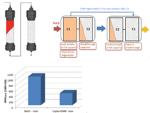 傳統層析工藝,由于流穿效應,有30-50%的填料是無(wú)法被完全利用的,從而使得載量和處理量大為受限。Capture SMB用于優(yōu)化捕獲環(huán)節,作為最簡(jiǎn)單和最強大的2柱位設計,可使純化效率顯著(zhù)提高,并且使填料用量大為縮減。