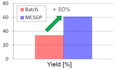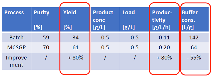 有案例證明,MCSGP可將產(chǎn)品純度從傳統工藝的59%提升至70%,將收率從傳統工藝的34%提升至61%,從而使產(chǎn)量(g /L /h)整體提升80%,并同時(shí)使Buffer的消耗量降低55%。MCSGP工藝,無(wú)疑可顯著(zhù)地節約成本投入,并可產(chǎn)生更多的生產(chǎn)效益。