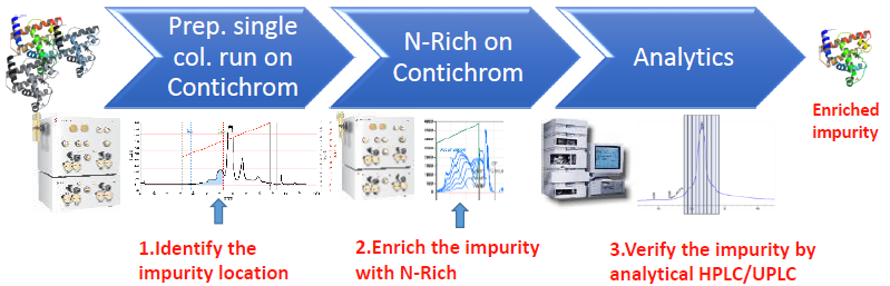 N-Rich工藝是微量物質(zhì)的富集過(guò)程,比如將產(chǎn)品的相關(guān)雜質(zhì)選擇性地富集在一個(gè)循環(huán)的層析過(guò)程中,待富集至目標量,再進(jìn)行洗脫回收。該方法特別適用于分離與產(chǎn)品有關(guān)的雜質(zhì),如異構體和聚集體,并同時(shí)用于發(fā)現研究。