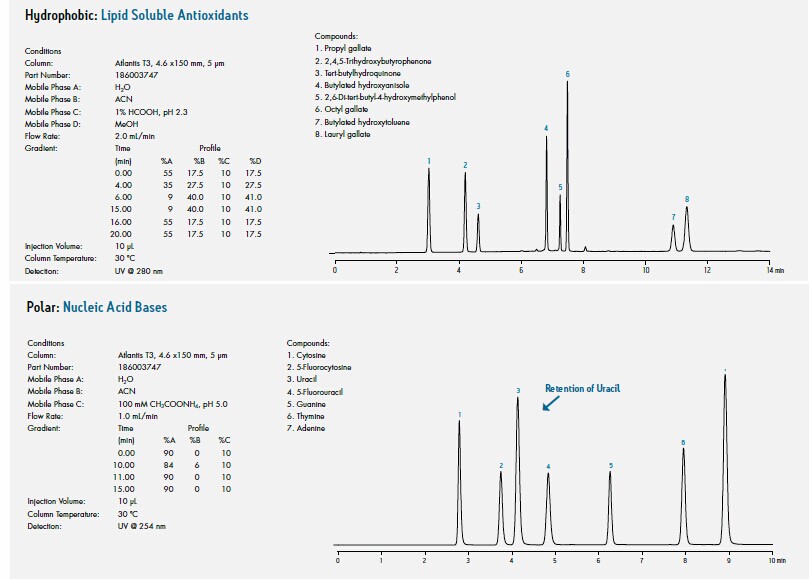 在對于極性化合物的反相HPLC保留與分離方面,Atlantis T3為極性化合物保留設立了行業(yè)標準。Atlantis T3色譜柱是通用的、硅膠反相C18柱,它不僅能保留和分離水溶性的極性小分子有機化合物,而且還為這項優(yōu)異能力提供了更寬的pH操作范圍。對于反相應用,要開(kāi)發(fā)極性(和非極性)化合物的保留分離方法時(shí),Atlantis T3應該作為第一選擇。